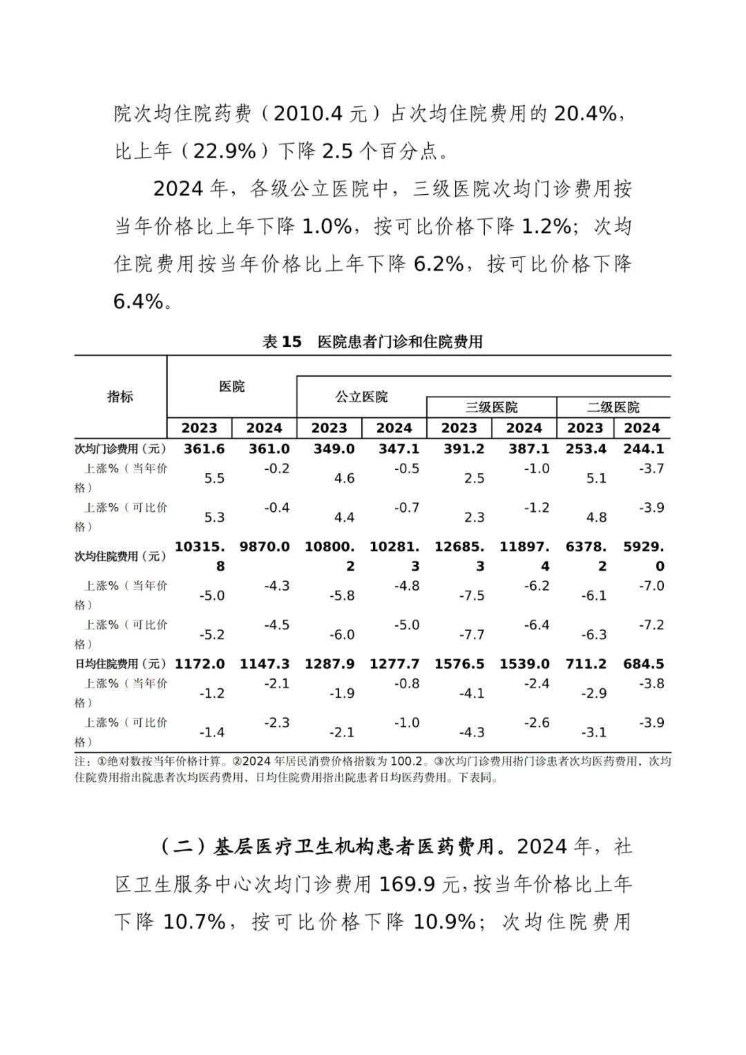 《公報》表明,次均醫(yī)療費用控制有成效。2024年,醫(yī)院次均住院費用9870.0元,按當年價格比上年下降4.3%,按可比價格下降4.5%;次均門診費用361.0元,按當年價格比上年下降0.2%,按可比價格下降0.4%。2024年全國衛(wèi)生總費用初步核算為90895.5億元,其中:政府衛(wèi)生支出22608億元,占24.9%;社會衛(wèi)生支出43280億元,占47.6%;個人衛(wèi)生支出25007.5億元,占27.5%。人均衛(wèi)生總費用6454.4元,衛(wèi)生總費用占GDP的比重為6.7%。